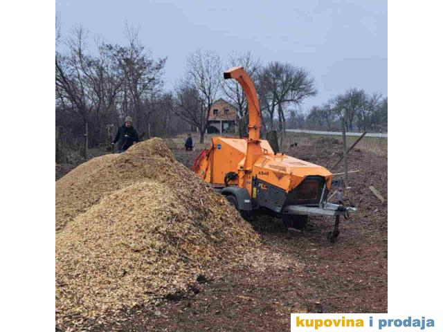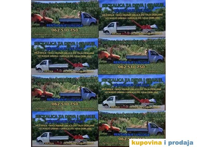 IZNAJMLjUJEM drobilicu malčer do 10-15-18 cm debljine granja, drveta i Seckalicu do 10 cm debljine granja ili drveta. Jedan radni dan od 8⁰⁰do16⁰⁰h (8h) Moze najam na sat ili komplet usluga. Radni učinak zavisi od vrste sirovine - drveta. Prosek Drobilice cca 18 prm³/h granja odnosno do 20m³ gotove sečke..za 8h rada Radni učinak Seckalice od 4-6 m³ gotovog materijala za 8 h rada. Visestruko se umanjuje kubikaza materijala i omugućava lakši transport . Materijal se moze pakovati u džakove ili boksove i koristiti kao ogrev, za malčiranje, pelet, nasipanje staza ......i sl. Dodatna usluga. Krčenje - košenje - skupljanje i odnošenje lišća, baštenskog otpada, fezovanje, sečenje starih i visokih stabala sa profesionalnim alatima i radnicima -Alpinistima.. Usluga za celu SRB.
